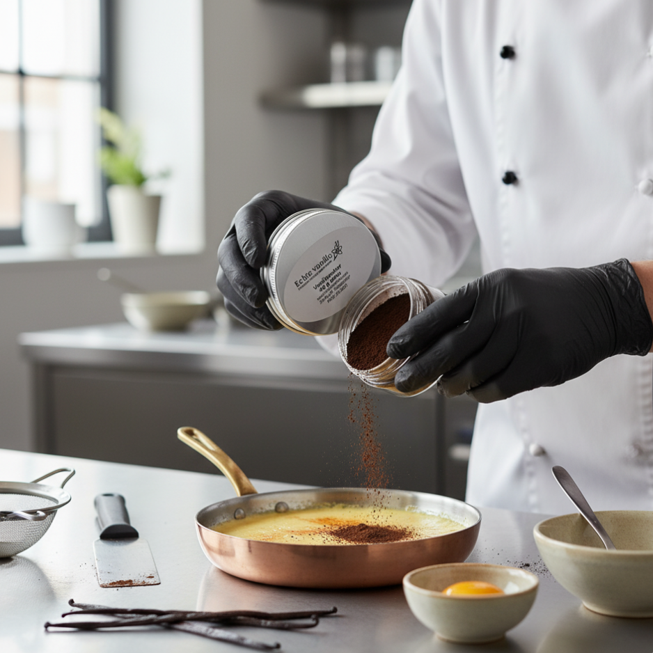 Entdecken Sie ein aromatisches, Gourmet-Vanillepulver mit kräftigem Geschmack, blumigen Noten und einem einzigartigen Hauch von Schokolade.