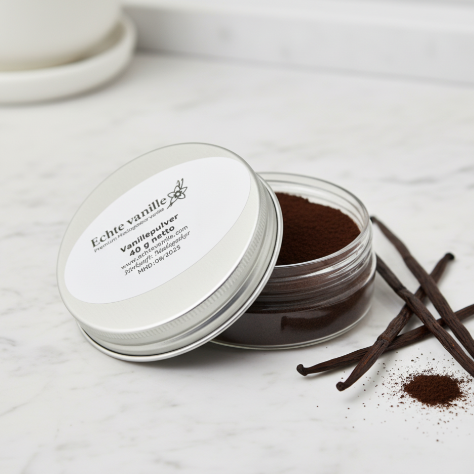 Ein hoch aromatisches Vanillepulver, hergestellt aus 100 % Planifolia-Vanilleschoten aus Madagaskar, sorgfältig ausgewählt aus unserer Premiumlinie Echte Vanille®.