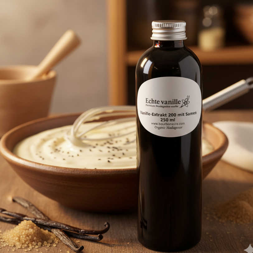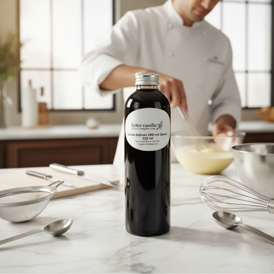 Ohne Farbstoffe, ohne Konservierungsmittel und alkoholfrei – ein sofort einsatzbereites Premium-Zutat, geeignet für nahezu alle Rezepte auf Vanillebasis.