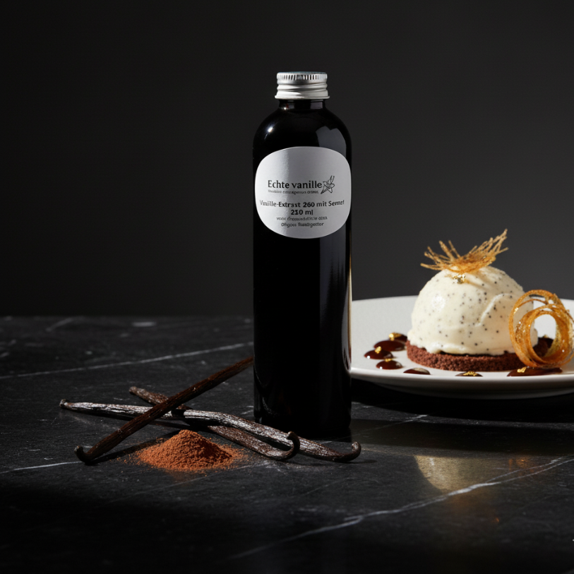 Mit einer feinen, einzigartigen Rezeptur erhalten wir ein hellbraunes, flüssiges Produkt mit natürlichen Vanillesamen, die als Qualitätsmerkmal dienen und deinen Zubereitungen eine elegante und authentische Optik verleihen.